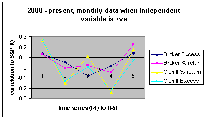 I am an International Relations student from St Andrews, Scotland, working for Victor through the summer, and my search for studies to run brought me round to updating this one. To substantiate the study, as well as using Merrill Lynch data I formed a brokerage index of 12 of the top 15 brokerage houses, evaluated by market cap. I looked at the percentage returns / excess returns, (over the dependent variable), of these two indicators for time periods t-1 to t-5 to try and predict the S&P 500 futures percentage return for time period t. I used weekly, monthly, quarterly and yearly data.