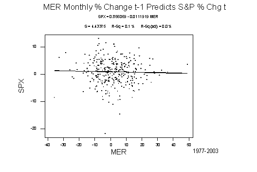 A Positive Suggestion (Dec. 15, 2003). One of the good things that people can do with charts is to discern statistical relations that wouldn't be obvious unless many separate tests were run. I found that when I looked at VIX there were clusters of values in the mid-1990s, with the range being between 12 and 15 for 50 of 60 months. Then from 1997 to 2003 the range is between 20 and 30 with about 50 of 70 observations between 20 and 25. There is a regime shift clearly indicated as of mid-1997 with values since then averaging some 50% more than values before. The variability of VIX has also increased, with the average variability between months in 1992 to 1997 being some 2% and it moving up to 4% in 2000 to 2003. finally there is evidence of persistence with the serial correlation of the levels (not the changes) being very high -- let's call it 50%.