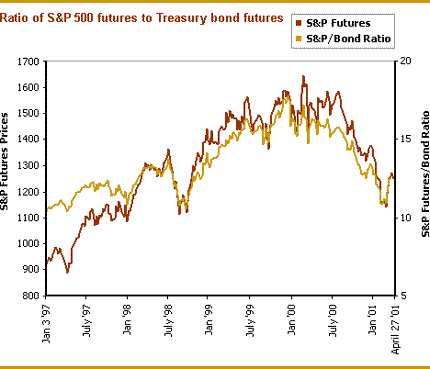 The conventional wisdom, encountered by the investor at every turn and embodied in almost every piece of market commentary, is that stocks and bonds are tightly and fatefully bound together. “Stocks rose on optimism for lower interest rates (higher bond prices),” runs a typical headline. And its twin: “Stocks fell on concern that interest rates are headed higher (bond prices are headed lower.)" Investors are taught that stock values are based on a discounted stream of future earnings and dividends, and that the higher the interest rate, the lower the value of the earnings. They also are told that stocks and bonds are alternative investments, and when yields on bonds are high, investment in stocks is crowded out. But is this conventional wisdom true? In part. Long-term rates can jerk up so much that they cause stocks to slide, but the relationship between long-term rates and stocks is a very subtle one, as we shall show below. Knowing its intricacies can help you decide whether you want to be in stocks or bonds. As we write Tuesday afternoon, the market is gyrating madly. The Fed just cut the federal funds rate to a seven-year low of 4%, bond yields are at six-month highs and short-term rates are at four-year lows. Are these relationships bearish or bullish? Are they predictive or descriptive? Are they constant, or ever changing? To unravel this mystery, we first constructed a series of actual bond and euro prices. But the relationships between these prices are so complex that we quickly decided it was necessary to perform some triage. Finding that short-term interest rates have little if any predictive relationship to stock prices, we chose to concentrate instead on the relation between stock and bond prices. The stock-to-bond ratio But first, a review of Bonds 101. A bond's yield represents the interest rate that would equalize the present value of the fixed payments with the current price and its price at maturity. Thus, bond yields and prices are on a seesaw; when one goes up, the other goes down. Now, back to the mysterious relationships between bonds and stocks. A good way to think about it is to consider how many bonds it would take to buy one S&P 500 futures contract. For example, if the S&P is at 1,000 and Treasury bond futures are quoted at 100, the ratio is 10-to-1. If the S&P is at 1,700 and bonds are at 100, the ratio is 17-to-1. Think of it as opportunity cost. If the ratio is 17-to-1 and you buy one unit of stocks, you forego buying 17 units of bonds. Over the past six years, the ratio of S&P 500 stock futures to Treasury bond futures has oscillated between 11-to-1 and 17-to-1. ![]() Other things being equal, stocks were less attractive as potential investments on occasions when the ratio of S&P 500 futures to long bond futures was highest, and more attractive when it was lowest. For example, the ratio was very low, about at its current levels, during the Long Term Capital Management credit crisis of 1998. As the S&P 500 ($INX) moved up 400 points during the next year and a half, the ratio moved up to 17-to-1. From that level, the S&P 500 fell from 1,500 to its current level of roughly 1,250, accompanied in its descent by the ratio. Regrettably, the level of the ratio doesn’t tell you anything about the subsequent move in stock prices. In technical terms, the correlation is close to zero. The change counts More useful for predicting where the stock market may go next are changes in the stock-to-bond ratio. Over the past six years, using the ratio of current stock futures to current bond futures, we find a very strong inverse relationship between changes in the ratio and subsequent changes in the S&P 500. For every one-point increase in the ratio, the S&P could be predicted to fall an extra 14 points. And when the ratio falls one point, the S&P could be expected to rise 14 points. In other words, if stocks prices move too fast compared with bonds, and you will soon see -- perhaps as soon as a week -- stocks move down again. If prices fall too fast, a rally is soon to follow. Note that in considering a relationship of this nature, it is good to keep in mind not only the magnitude of the link but its certainty. Based on the variabilities involved, we can say that the chance that this is a true departure from randomness approaches 98%. The system was at its least useful when there were large rises in the ratio. These should have been followed by large declines; instead, S&P prices were all over the map in the following week. The two big declines in the ratio were more predictive, both being followed by very substantial rises in the S&P. (E-mail us for a table of the data, if you are interested.) Here’s how it works in practice. Last week, the stock-to-bond ratio rose 0.18 point, as shown in the table below. Friday, May 4
