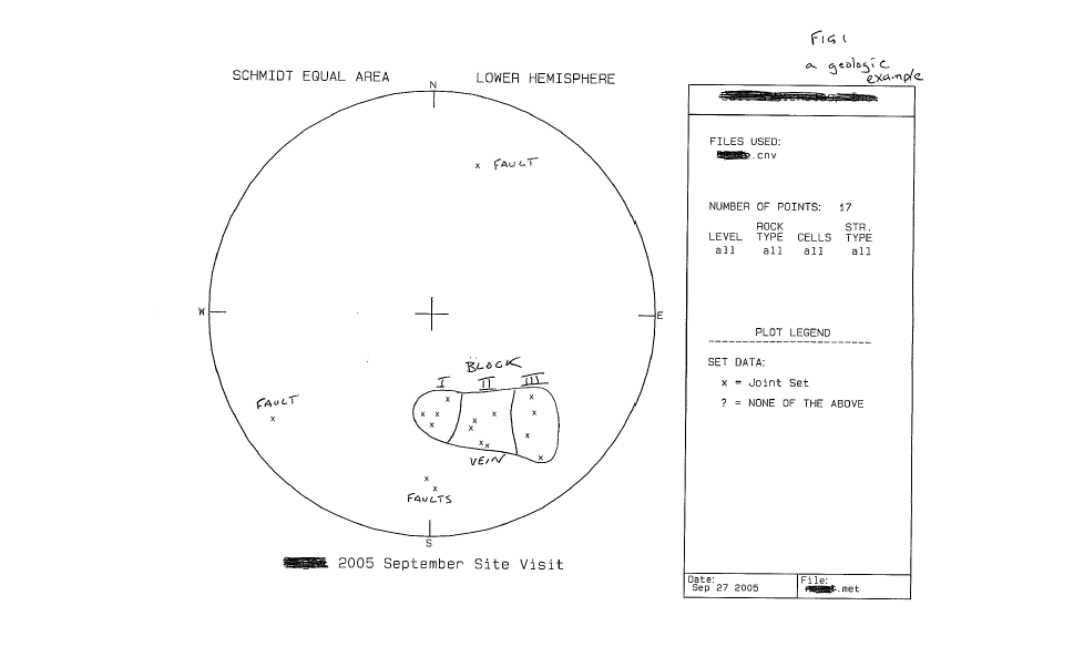 I routinely use polar coordinates in my work and would be remiss if I did not comment on this subject. Polar coordinates are very useful for visualization of data where you have three to four dimensions. For example, while in Montana several weeks ago, I conducted mapping to determine the three dimensional geometry of a vein of ore cut by several faults. (fig. 1) By using polar coordinates, and a compass, one can quickly measure the attitude of the vein using two measures; the strike of the vein which is the angular measurement from the north pole of the line that the vein makes when crossing the horizontal plane, and the dip of the vein which is the measurement of the angle between the vein and the horizontal plane in a direction that is orthogonal to the line of strike. These two angular measurements are all that is needed to describe the three dimensional planar body in a polar coordinate system. Similarly, two angular measurements can be used to describe a line in three dimensional space (trend angle and plunge angle) by projecting the line onto the horizontal plane. In this case it was obvious even with just a few measurements that the faults were indeed changing the orientation of the vein from block to block and therefore this needed to be taken into consideration of any projection of where the vein was going.