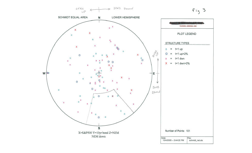 For an example of how this might work with non-geologic data I took the daily change for the S&P500 in 2005, the daily change in the 10 year bond in 2005, and the daily change in Newmont Mining common stock, one of the larger publicly traded gold mining stocks. By assigning the change in the S&P to the x axis, the change in the bond to the y axis and the change in NEM common to the z axis, I can use the three daily change numbers to calculate a vector in 3-dimensional space for each trading day, similar to what Dr. Castaldo was doing. These can be converted to two angles for plotting in a polar coordinate system, the trend varying from 0-360 degrees, with plunges of 0-90 degrees, and then the vectors can be easily plotted in the polar system using a Schmidt equal area projection where each vector, moving outward from the origin, is represented by its pierce point on the outer shell of the globe which is then projected to the horizontal plane (or any other plane of our choosing although the horizontal plane is the standard method). In this case I have segregated the data into two data sets, days when NEM is up and days when NEM is down. Each data point was then labeled with a symbol to denote whether the next day NEM was up, up more than 2%, down, or down more than 2%. Figure 2, 3 present the data generated and plotted in a polar coordinate system. To understand the relationships, consider the four quadrants (NE, SE, SW, NW). In this case because of my assumptions, the NE quadrant represents days when bonds are up and stocks are down, the SE quadrant represents days when bonds and stocks are both down, the SW quadrant represents days when stocks are up and bonds are down, and the NW quadrant represents days when stocks and bonds are both up. Furthermore, to confuse the reader, I have plotted orthogonal vectors rather than the vectors themselves, so that steeply plunging vectors lie on the outer edge of the circle and flatter vectors appear near the origin (small changes near the center, big changes are near the outer edge).