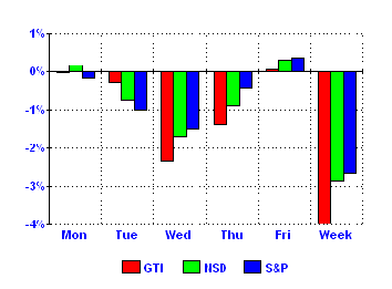 It was a wretched week. The GTI fell 4.0%, its worst performance in six months. Only one of the 28 GTI stocks finished with a gain, and three of them (EQIX, NETL, and TXN) had losses on the order of 10%. Adding insult to injury, the GTI's eight-week winning streak against the NASDAQ came to an end, and the GTI is back in the red for the year.