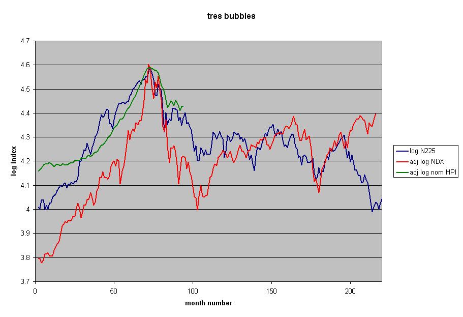 The above plots three asset price bubbles (defined in hindsight as big price run-ups followed by big declines); in Nasdaq, Nikkei 225, and nominal Shiller Home Price Index.