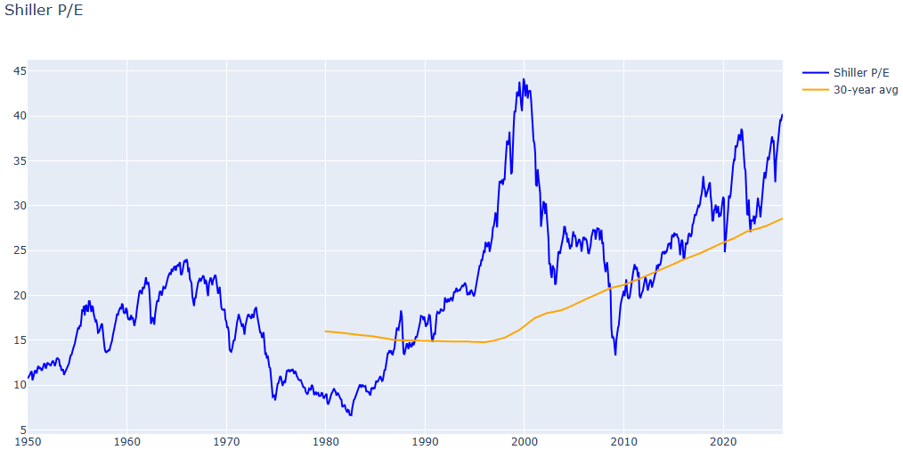 The Shiller Cyclically Adjusted Price Earnings (CAPE) ratio is at its second highest level in history, exceeded only in 1999-2000. What I find interesting is that the 30-year moving average of this ratio has nearly doubled since 1990. My theory is that permanently lower interest rates in an aging population support generally higher stock valuations than in past eras when large families were the norm.