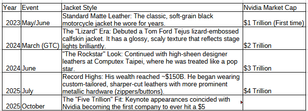I asked Gemini if the Nvdia stock price milestone dates associated with Jensen Huang's famous leather jackets. Here is the timeline of Jensen's jacket evolution alongside Nvidia’s stock milestones: