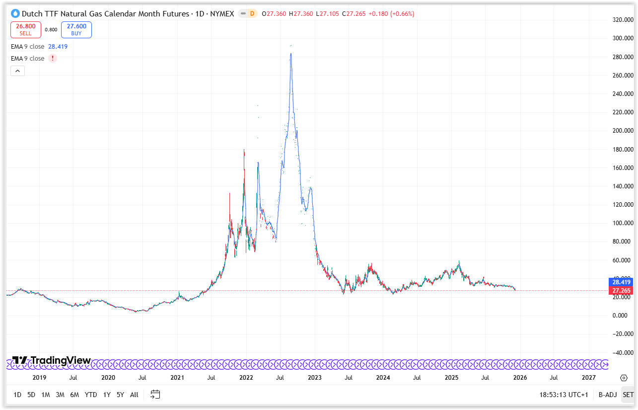 European Natural gas - not that far to test 2024 lows, and perhaps even pre-Ukraine-war levels eventually? Peace coming (?) Or general decline in Gas prices (US natty has gone the other direction for a while).