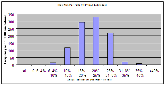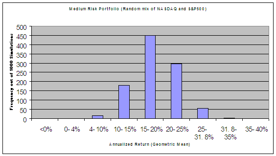 In my bootstrap method, I recreated a 20-year history of returns (54/50 invested for 20 years) by randomly picking 240 monthly returns from the actually historical monthly returns for which I had data. I then ran between 1000 and 10,000 simulations repeating the same bootstrap method. In order to beat the 54/50 fund, the simulated portfolio results had to exceed 31.8% annual return, the lowest possible return the 54/50 could have achieved. My results reveal that the high risk portfolio randomly outperformed 2.7% of the time (27 of 1,000 simulations), the medium risk only 0.3% (3 out of 1,000), and the low risk never (0 out of 10,000). Here are the resulting histograms:
