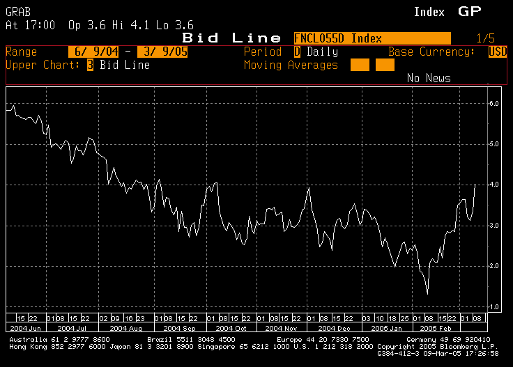 That was then and this is now, but the landscape seems similar. How much money has come into commodity indexing in the last year? To use just one example, how big has a certain fund led by a "talking your pessimistic position up" kind of manager's commodity index fund grown? I want to say something like: this firm grew from zero to $3.5 billion in 10 months. And even if the firm's growth is the most exceptional growth of indexed funds that pre-announce to the market their intention to make money via backwardation and thus pre-announce their intention to roll, aren't the trend followers also following a strategy that requires massive amounts of rolling? With the memories of some sweetly sung ballads drifting through my brain, I'm hard pressed to remember exact figures this early in the morning, but I recall a hazy memory from the FT of commodity funds' growing from $5 billion to $40 billion in in the past three years.