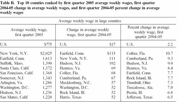 Note the middle column of this table from the recently-released Bureau of Labor Statistics report COUNTY EMPLOYMENT AND WAGES, FIRST QUARTER 2005: