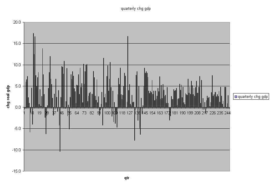 Noticeable reduction in volatility since the late 1980s, dating with the Greenspan tenure. The attached chart shows the source data, which suggests we have been in much more stable economy in the recent 20 years.